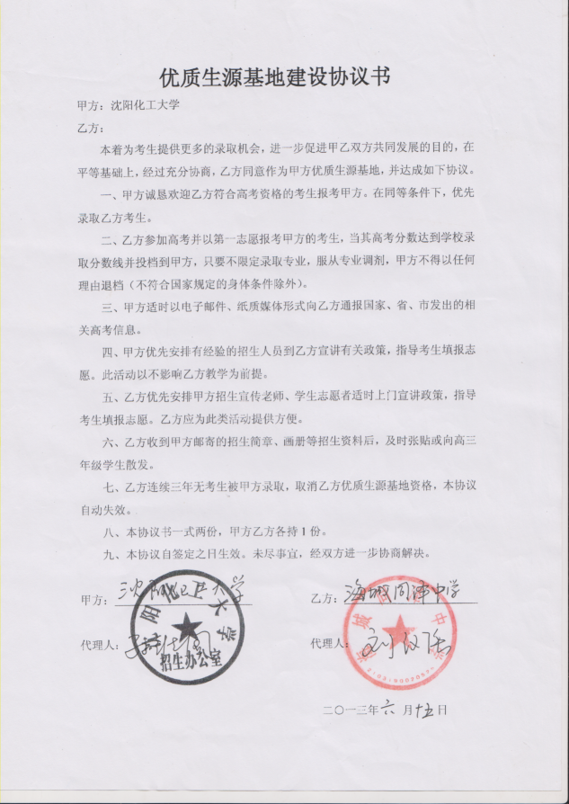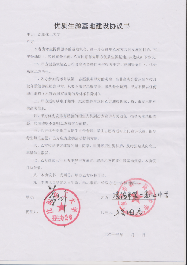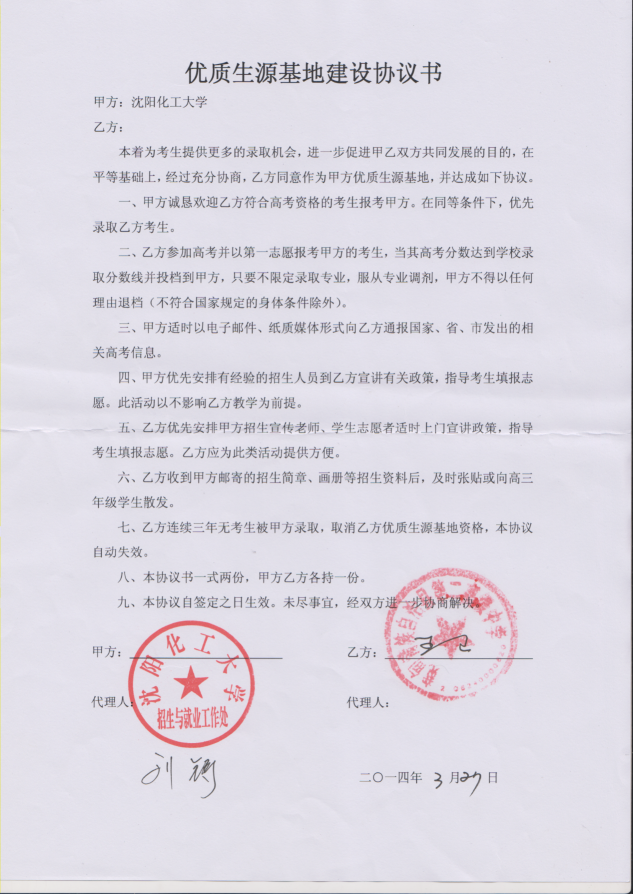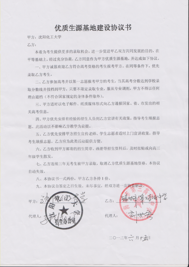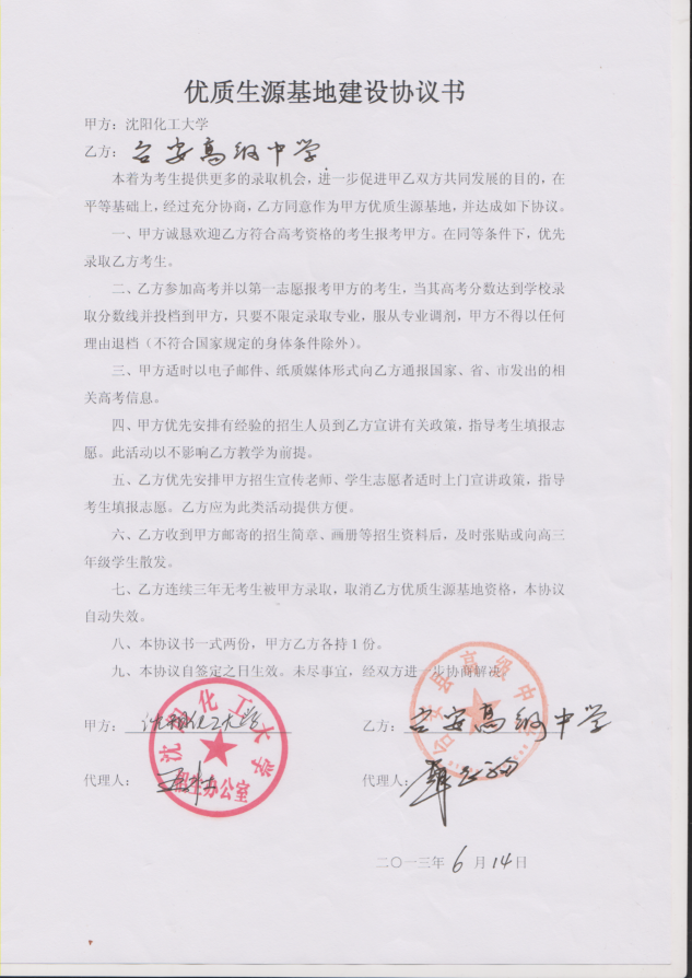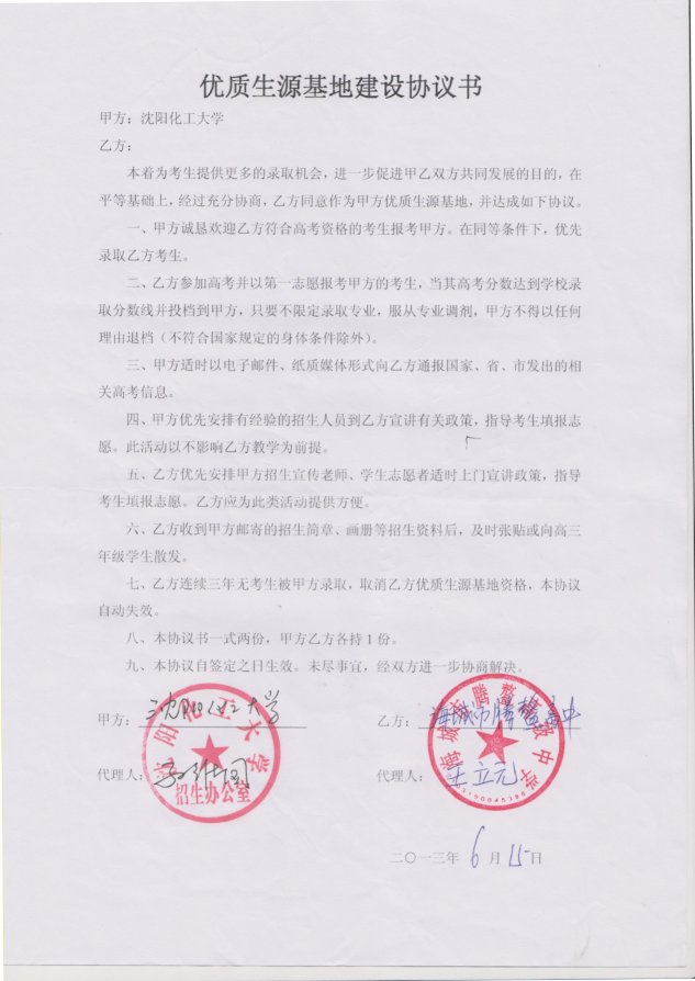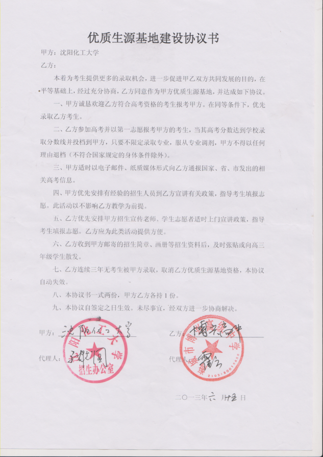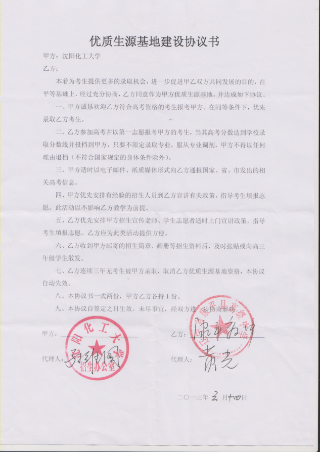 三亿体育官方网站从2013年以来与省内15家高中签订了优质生源基地建设协议书,以下是优质生源基地建设协议书的扫描件。