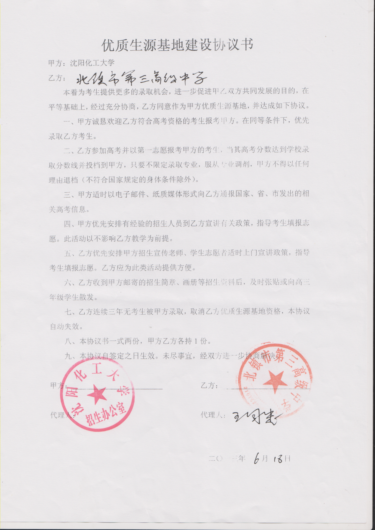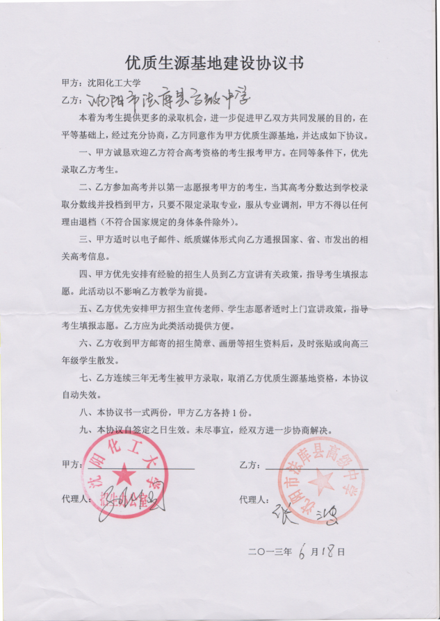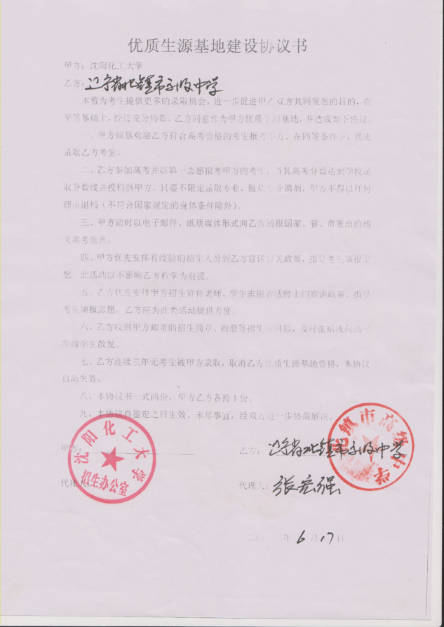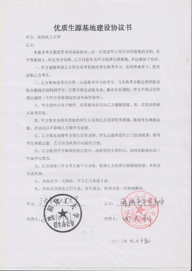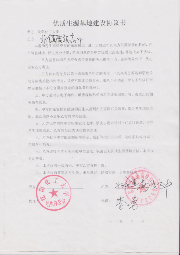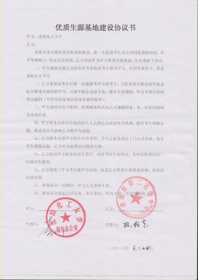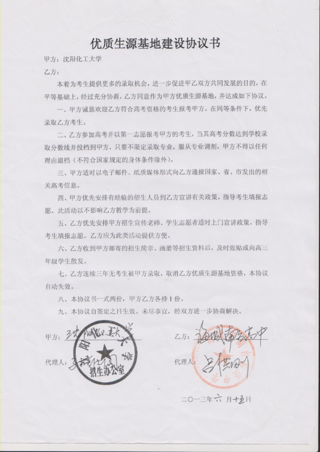 三亿体育官方网站从2013年以来与省内15家高中签订了优质生源基地建设协议书,以下是优质生源基地建设协议书的扫描件。