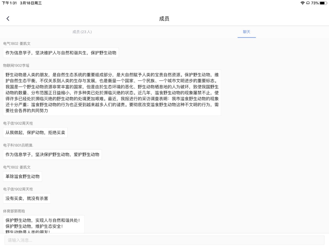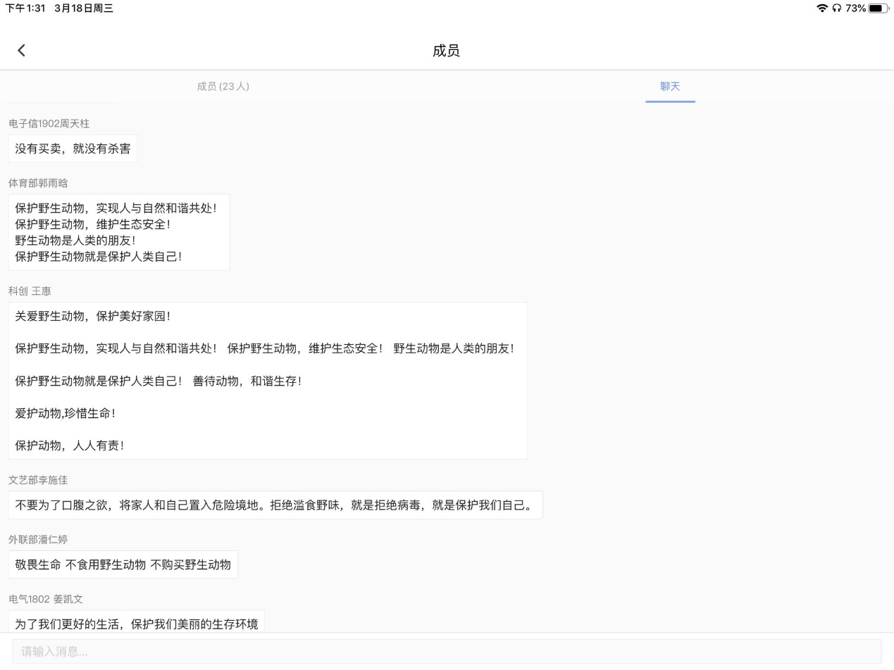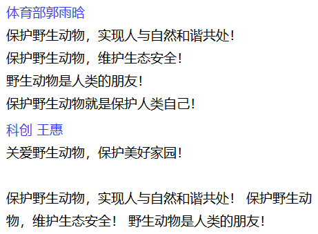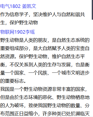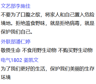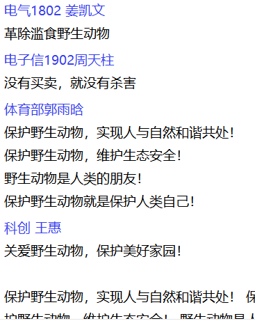 张庆:作为化大信息学子我承诺:尊重自然,尊重生命,用我们的善意去呵护自然界中的每一个生命。坚决不食用野生动物,拒绝购买任何野生动物制品。保护野生动物,人人有责,让我们携手,从现在做起,共创人与自然和谐发展的绿色家园。