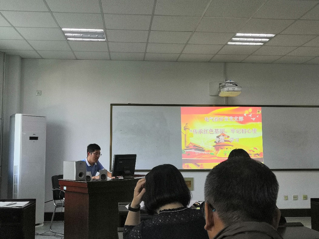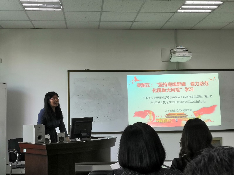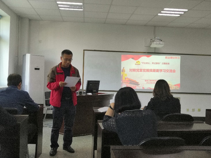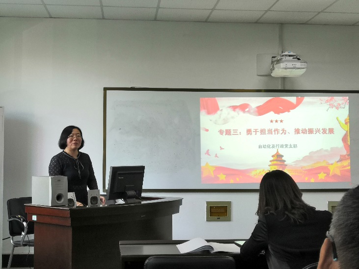 活动第三部分是“对照党章党规找差距学习交流会”,由五位党支部书记、副书记带领与会同志共同学习“不忘初心、牢记使命”主题教育的五个专题内容,介绍支部学习情况和支部党员同志们的体会。电气党支部副书记安树祥同志领学了专题一:传承红色基因、牢记初心使命,通信和电子科党支部书记王健同志领学了专题二:坚守绝对忠诚、做到“两个维护”,自动化及行政党支部书记郭小萍同志领学了专题三:勇于担当作为、推动振兴发展,电子教研室党支部书记颜闽秀同志领学了专题四:坚持全面从严治党、营造良好政治生态,电子信息和物联网党支部书记赵立杰同志领学了专题五:牢固树立底线思维、防范化解重大风险。