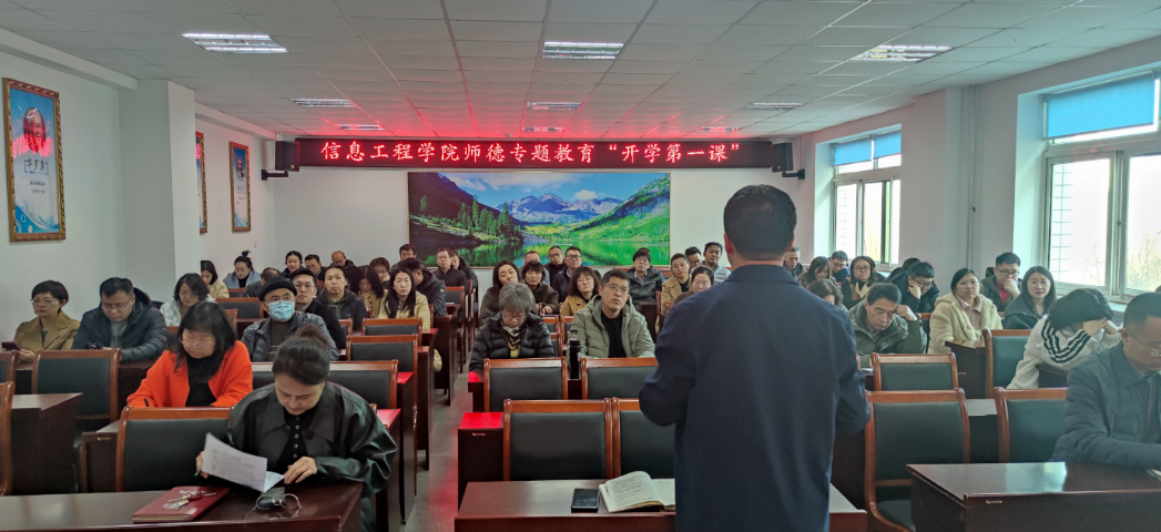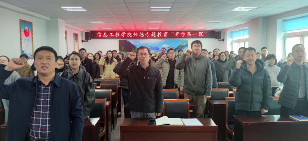最后,全体教师在梁洪的带领下庄严宣誓:我志愿成为一名光荣的人民教师,忠诚于党和人民的教育事业,贯彻党的教育方针,履行教师神圣职责,恪守教师职业道德。热爱员工,为人师表;追求真理,崇尚科学;依法执教,教书育人;勤勉敬业,严谨治学;团结协作,乐于奉献。做有理想信念、有道德情操、有扎实学识、有仁爱之心的好老师,为教育发展、国家繁荣和民族复兴努力奋斗!