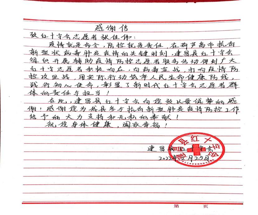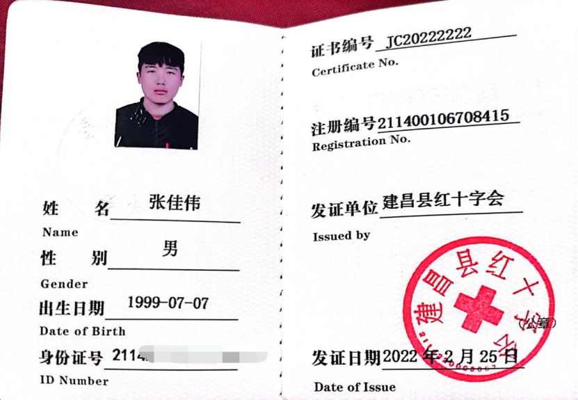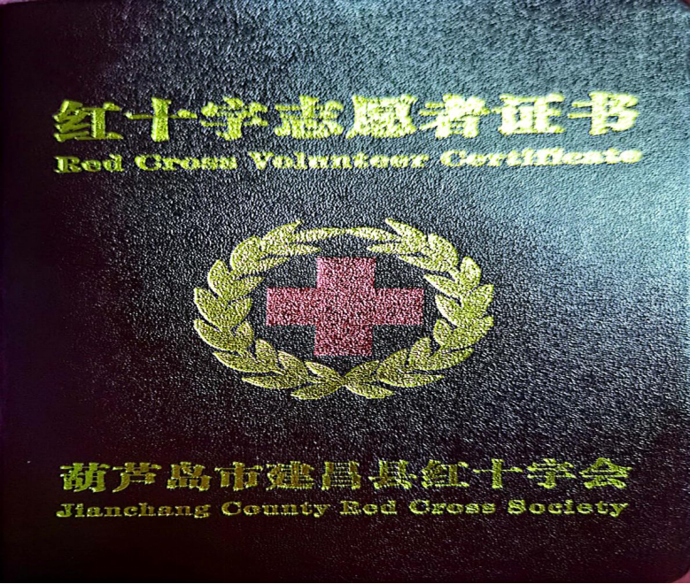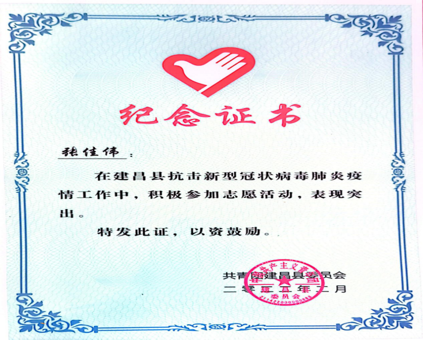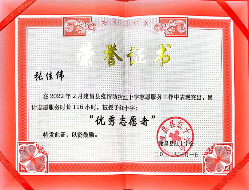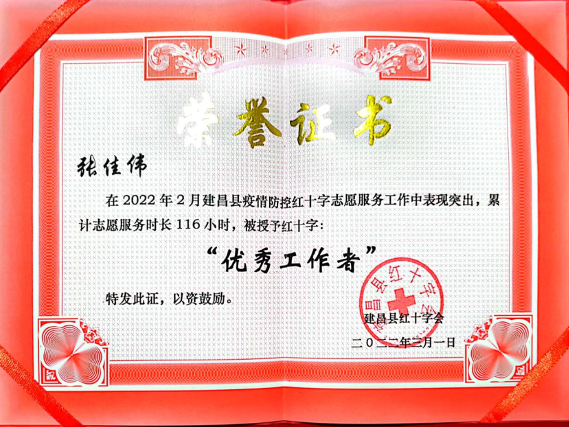 张佳伟同学在家乡遭受疫情侵害时冲锋在前、不畏困难、不惧严寒,积极投身到新冠肺炎疫情防控的工作中,并且作出了突出贡献,为当地政府以及医务人员缓解压力,充分展现出一名共产党员应有的素质和青年学子的热血与担当。在志愿服务结束后,建昌县红十字会亲自向张佳伟同学颁发了荣誉证书!